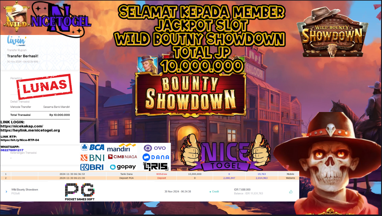 Selamat kepada User id : ambul*** Telah berhasil mendapatkan kemenangan besar pada permainan SLOT WILD BOUNTY SHOWDOWN Dengan kemenangan Sebesar Rp.10.000.000,- Setelah mengisi formulir withdraw dengan kurung waktu hanya 5 – 10 menit pihak NICETOGEL sudah melakukan transfer kepada pemilik Userid dan dana sudah dapat di cairkan oleh pemenang. Bukti pembayaran yang kami berikan merupakan bukti pembayaran yang SAH / VALID yang langung di dapatkan melaui tanda transfer transaksi dari Bank yang di tuju.