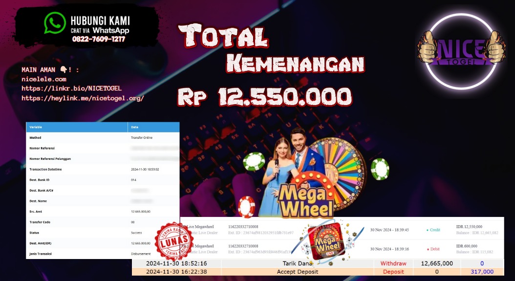 Selamat kepada User id : supr*** Telah berhasil mendapatkan kemenangan besar pada permainan LIVE GAME MEGA WHEEL Dengan kemenangan Sebesar Rp.12.550.000,- Setelah mengisi formulir withdraw dengan kurung waktu hanya 5 – 10 menit pihak NICETOGEL sudah melakukan transfer kepada pemilik Userid dan dana sudah dapat di cairkan oleh pemenang. Bukti pembayaran yang kami berikan merupakan bukti pembayaran yang SAH / VALID yang langung di dapatkan melaui tanda transfer transaksi dari Bank yang di tuju.