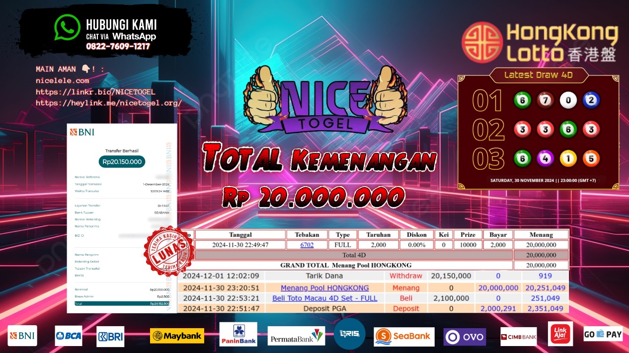 Selamat kepada User id : CT23*** Telah berhasil mendapatkan kemenangan besar pada permainan TOGEL HONGKONG LOTTO Dengan kemenangan Sebesar Rp.20.000.000,- Setelah mengisi formulir withdraw dengan kurung waktu hanya 5 – 10 menit pihak NICETOGEL sudah melakukan transfer kepada pemilik Userid dan dana sudah dapat di cairkan oleh pemenang. Bukti pembayaran yang kami berikan merupakan bukti pembayaran yang SAH / VALID yang langung di dapatkan melaui tanda transfer transaksi dari Bank yang di tuju.