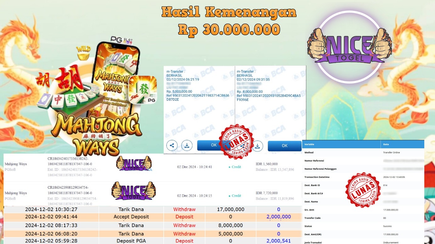Selamat kepada User id : kimco8*** Telah berhasil mendapatkan kemenangan besar pada permainan SLOT MAHJONG WAYS Dengan kemenangan Sebesar Rp.30.000.000,- Setelah mengisi formulir withdraw dengan kurung waktu hanya 5 – 10 menit pihak NICETOGEL sudah melakukan transfer kepada pemilik Userid dan dana sudah dapat di cairkan oleh pemenang. Bukti pembayaran yang kami berikan merupakan bukti pembayaran yang SAH / VALID yang langung di dapatkan melaui tanda transfer transaksi dari Bank yang di tuju.