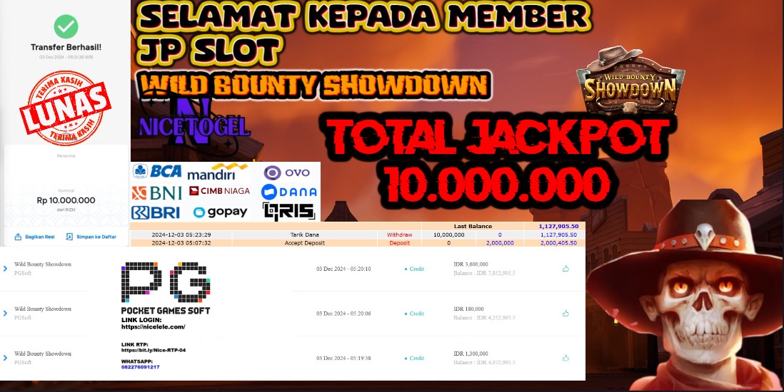 Selamat kepada User id : algo*** Telah berhasil mendapatkan kemenangan besar pada permainan SLOT WILD BOUNTY SHOWDOWN Dengan kemenangan Sebesar Rp.10.000.000,- Setelah mengisi formulir withdraw dengan kurung waktu hanya 5 – 10 menit pihak NICETOGEL sudah melakukan transfer kepada pemilik Userid dan dana sudah dapat di cairkan oleh pemenang. Bukti pembayaran yang kami berikan merupakan bukti pembayaran yang SAH / VALID yang langung di dapatkan melaui tanda transfer transaksi dari Bank yang di tuju.