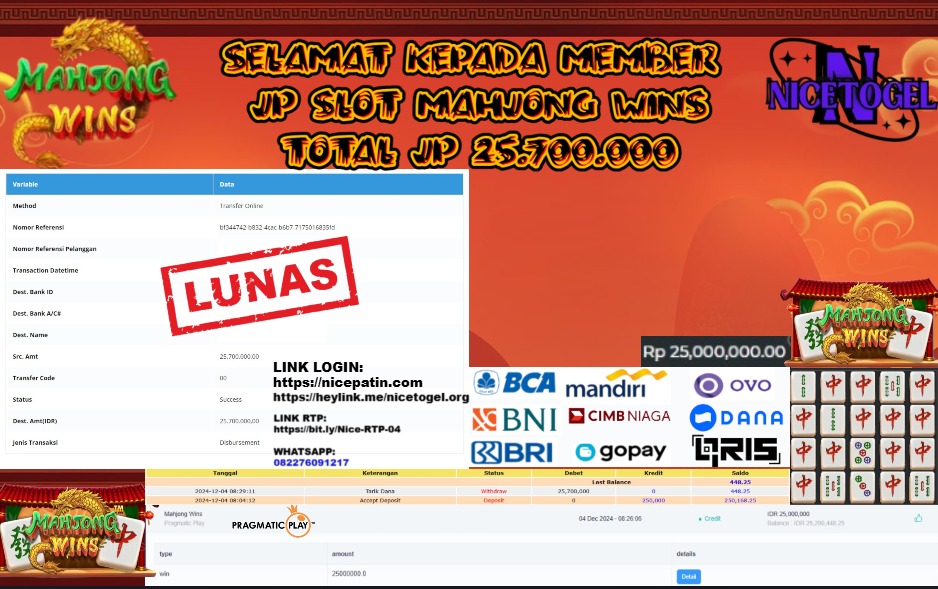 Selamat kepada User id : dnaw*** Telah berhasil mendapatkan kemenangan besar pada permainan SLOT MAHJONG WINS Dengan kemenangan Sebesar Rp.25.700.000,- Setelah mengisi formulir withdraw dengan kurung waktu hanya 5 – 10 menit pihak NICETOGEL sudah melakukan transfer kepada pemilik Userid dan dana sudah dapat di cairkan oleh pemenang. Bukti pembayaran yang kami berikan merupakan bukti pembayaran yang SAH / VALID yang langung di dapatkan melaui tanda transfer transaksi dari Bank yang di tuju.
