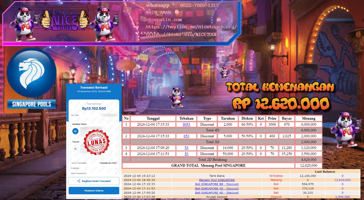 Selamat kepada User id : Yur856*** Telah berhasil mendapatkan kemenangan besar pada permainan TOGEL SINGAPORE POOLS Dengan kemenangan Sebesar Rp.12.620.000,- Setelah mengisi formulir withdraw dengan kurung waktu hanya 5 – 10 menit pihak NICETOGEL sudah melakukan transfer kepada pemilik Userid dan dana sudah dapat di cairkan oleh pemenang. Bukti pembayaran yang kami berikan merupakan bukti pembayaran yang SAH / VALID yang langung di dapatkan melaui tanda transfer transaksi dari Bank yang di tuju.