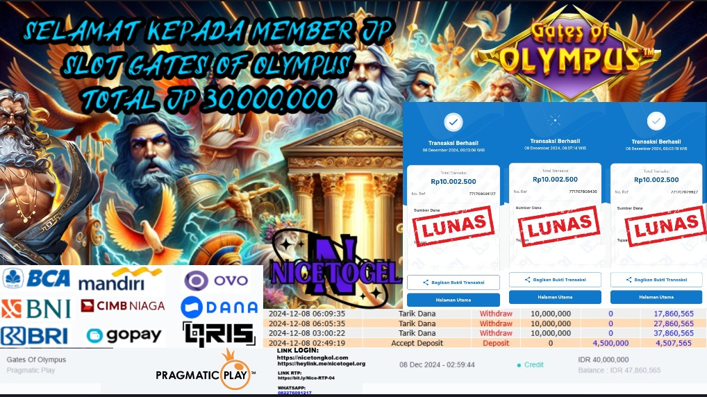 Selamat kepada User id : asade*** Telah berhasil mendapatkan kemenangan besar pada permainan SLOT GATES OF OLYMPUS Dengan kemenangan Sebesar Rp.30.000.000,- Setelah mengisi formulir withdraw dengan kurung waktu hanya 5 – 10 menit pihak NICETOGEL sudah melakukan transfer kepada pemilik Userid dan dana sudah dapat di cairkan oleh pemenang. Bukti pembayaran yang kami berikan merupakan bukti pembayaran yang SAH / VALID yang langung di dapatkan melaui tanda transfer transaksi dari Bank yang di tuju.