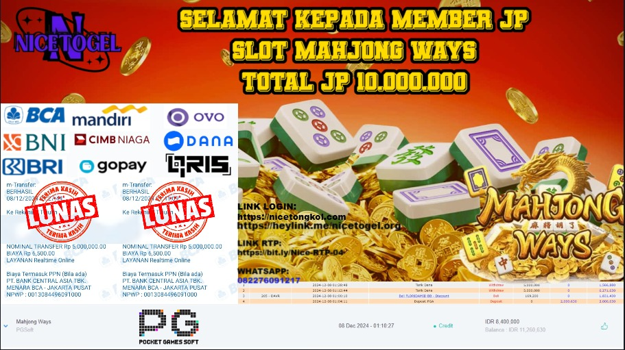 Selamat kepada User id : rarj*** Telah berhasil mendapatkan kemenangan besar pada permainan SLOT MAHJONG WAYS Dengan kemenangan Sebesar Rp.10.000.000,- Setelah mengisi formulir withdraw dengan kurung waktu hanya 5 – 10 menit pihak NICETOGEL sudah melakukan transfer kepada pemilik Userid dan dana sudah dapat di cairkan oleh pemenang. Bukti pembayaran yang kami berikan merupakan bukti pembayaran yang SAH / VALID yang langung di dapatkan melaui tanda transfer transaksi dari Bank yang di tuju.