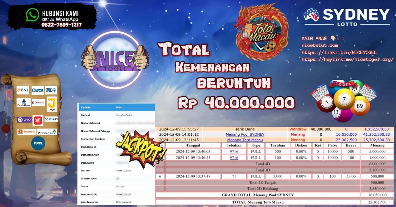 Selamat kepada User id : CEE520*** Telah berhasil mendapatkan kemenangan besar pada permainan TOGEL BERUNTUN TOTOMACAU 4D & SYDNEY LOTTO Dengan kemenangan Sebesar Rp.40.000.000,- Setelah mengisi formulir withdraw dengan kurung waktu hanya 5 – 10 menit pihak NICETOGEL sudah melakukan transfer kepada pemilik Userid dan dana sudah dapat di cairkan oleh pemenang. Bukti pembayaran yang kami berikan merupakan bukti pembayaran yang SAH / VALID yang langung di dapatkan melaui tanda transfer transaksi dari Bank yang di tuju.