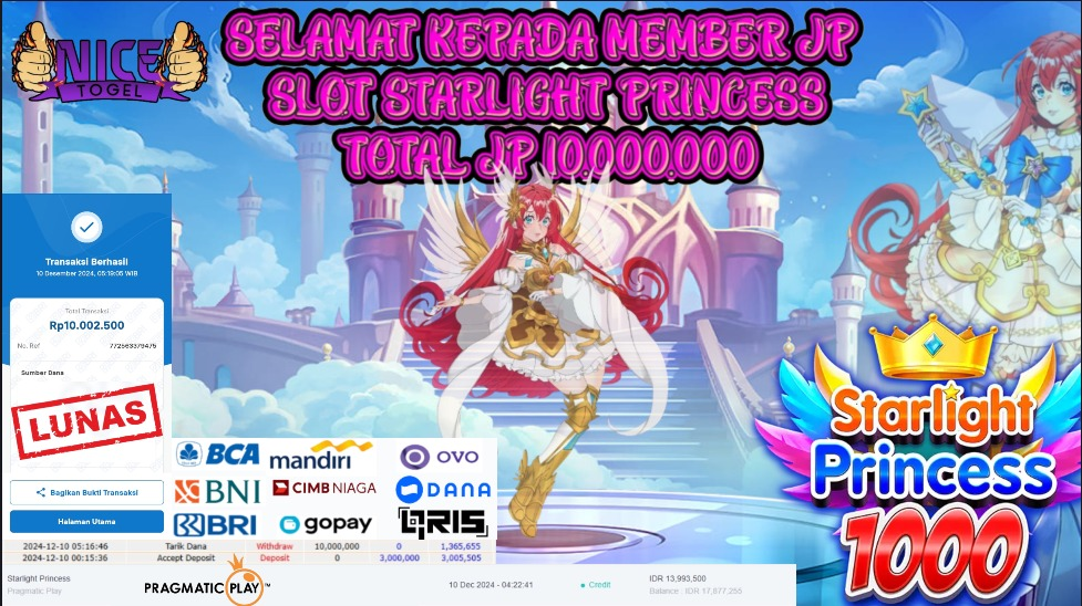 Selamat kepada User id : aca*** Telah berhasil mendapatkan kemenangan besar pada permainan SLOT STARLIGHT PRINCESS Dengan kemenangan Sebesar Rp.10.000.000,- Setelah mengisi formulir withdraw dengan kurung waktu hanya 5 – 10 menit pihak NICETOGEL sudah melakukan transfer kepada pemilik Userid dan dana sudah dapat di cairkan oleh pemenang. Bukti pembayaran yang kami berikan merupakan bukti pembayaran yang SAH / VALID yang langung di dapatkan melaui tanda transfer transaksi dari Bank yang di tuju.