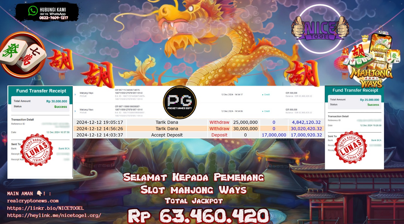 Selamat kepada User id : Haje785*** Telah berhasil mendapatkan kemenangan besar pada permainan SLOT MAHJONG WAYS Dengan kemenangan Sebesar Rp.65.460.420,- Setelah mengisi formulir withdraw dengan kurung waktu hanya 5 – 10 menit pihak NICETOGEL sudah melakukan transfer kepada pemilik Userid dan dana sudah dapat di cairkan oleh pemenang. Bukti pembayaran yang kami berikan merupakan bukti pembayaran yang SAH / VALID yang langung di dapatkan melaui tanda transfer transaksi dari Bank yang di tuju.