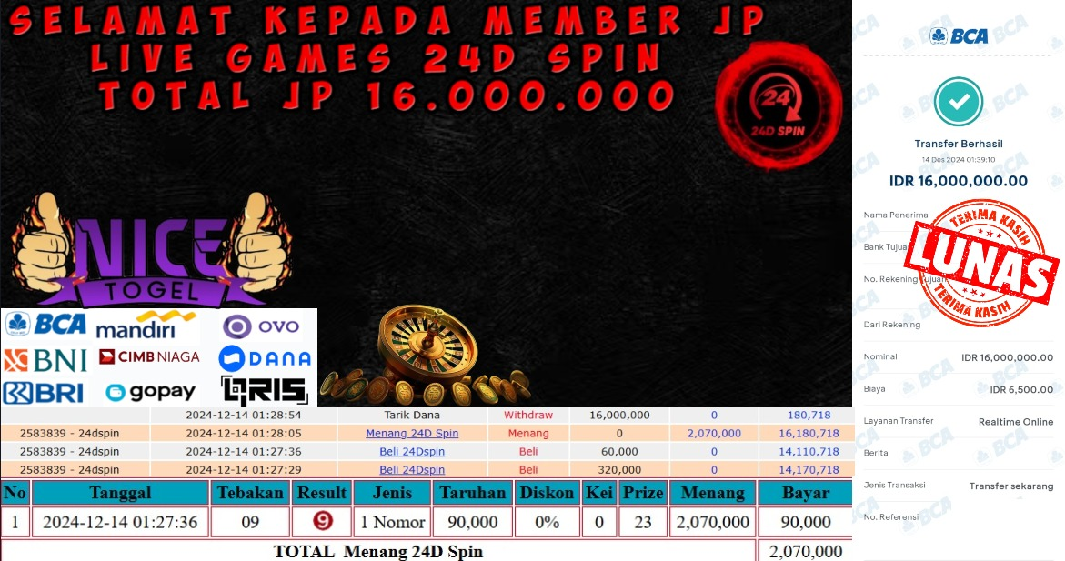 Selamat kepada User id : SAN** Telah berhasil mendapatkan kemenangan besar pada permainan LIVE GAMES 24D SPIN Dengan kemenangan Sebesar Rp.16.000.000,- Setelah mengisi formulir withdraw dengan kurung waktu hanya 5 – 10 menit pihak NICETOGEL sudah melakukan transfer kepada pemilik Userid dan dana sudah dapat di cairkan oleh pemenang. Bukti pembayaran yang kami berikan merupakan bukti pembayaran yang SAH / VALID yang langung di dapatkan melaui tanda transfer transaksi dari Bank yang di tuju.