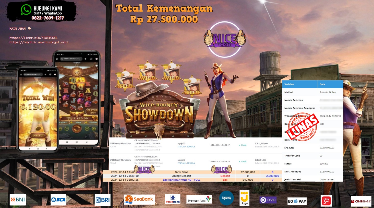 Selamat kepada User id : algo** Telah berhasil mendapatkan kemenangan besar pada permainan SLOT WILD BOUNTY SHOWDOWN Dengan kemenangan Sebesar Rp.27.500.000,- Setelah mengisi formulir withdraw dengan kurung waktu hanya 5 – 10 menit pihak NICETOGEL sudah melakukan transfer kepada pemilik Userid dan dana sudah dapat di cairkan oleh pemenang. Bukti pembayaran yang kami berikan merupakan bukti pembayaran yang SAH / VALID yang langung di dapatkan melaui tanda transfer transaksi dari Bank yang di tuju.