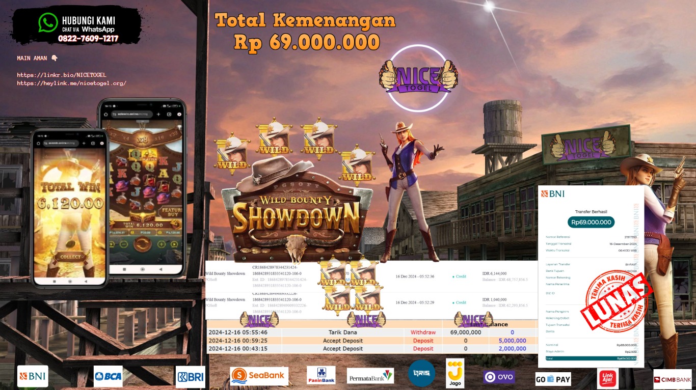 Selamat kepada User id : FRERI0** Telah berhasil mendapatkan kemenangan besar pada permainan SLOT WILD BOUNTY SHOWDOWN Dengan kemenangan Sebesar Rp.69.000.000,- Setelah mengisi formulir withdraw dengan kurung waktu hanya 5 – 10 menit pihak NICETOGEL sudah melakukan transfer kepada pemilik Userid dan dana sudah dapat di cairkan oleh pemenang. Bukti pembayaran yang kami berikan merupakan bukti pembayaran yang SAH / VALID yang langung di dapatkan melaui tanda transfer transaksi dari Bank yang di tuju.