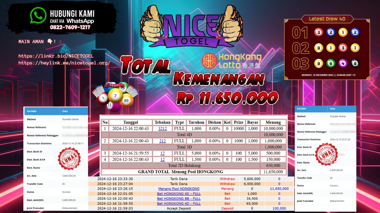 Selamat kepada User id : Poid77*** Telah berhasil mendapatkan kemenangan besar pada permainan TOGEL HONGKONG LOTTO Dengan kemenangan Sebesar Rp.11.650.000,- Setelah mengisi formulir withdraw dengan kurung waktu hanya 5 – 10 menit pihak NICETOGEL sudah melakukan transfer kepada pemilik Userid dan dana sudah dapat di cairkan oleh pemenang. Bukti pembayaran yang kami berikan merupakan bukti pembayaran yang SAH / VALID yang langung di dapatkan melaui tanda transfer transaksi dari Bank yang di tuju.