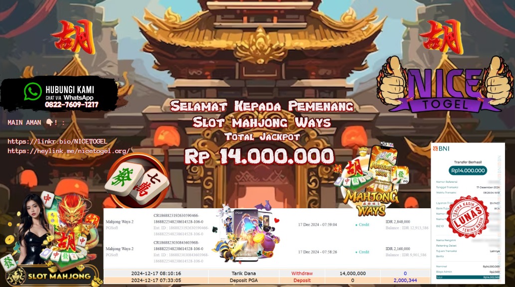 Selamat kepada User id : kim*** Telah berhasil mendapatkan kemenangan besar pada permainan SLOT MAHJONG WAYS Dengan kemenangan Sebesar Rp.14.000.000,- Setelah mengisi formulir withdraw dengan kurung waktu hanya 5 – 10 menit pihak NICETOGEL sudah melakukan transfer kepada pemilik Userid dan dana sudah dapat di cairkan oleh pemenang. Bukti pembayaran yang kami berikan merupakan bukti pembayaran yang SAH / VALID yang langung di dapatkan melaui tanda transfer transaksi dari Bank yang di tuju.