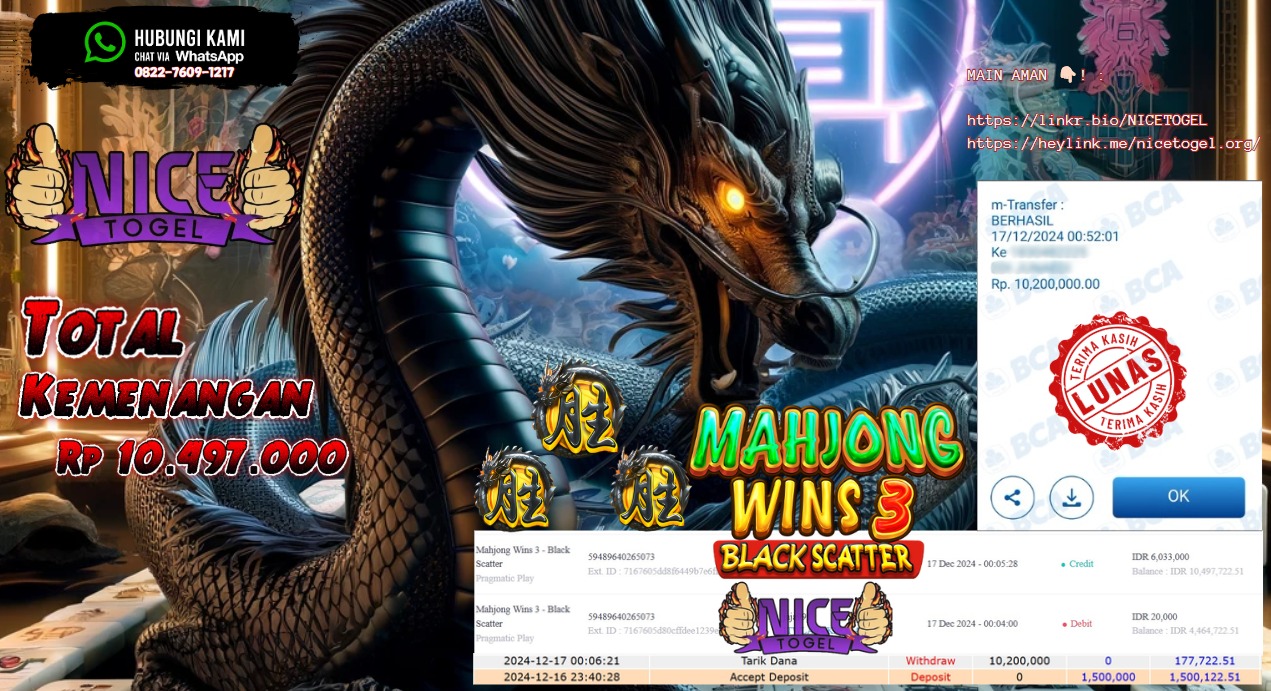Selamat kepada User id : surt5*** Telah berhasil mendapatkan kemenangan besar pada permainan SLOT MAHJONG WINS 3 Dengan kemenangan Sebesar Rp.10.497.000,- Setelah mengisi formulir withdraw dengan kurung waktu hanya 5 – 10 menit pihak NICETOGEL sudah melakukan transfer kepada pemilik Userid dan dana sudah dapat di cairkan oleh pemenang. Bukti pembayaran yang kami berikan merupakan bukti pembayaran yang SAH / VALID yang langung di dapatkan melaui tanda transfer transaksi dari Bank yang di tuju.