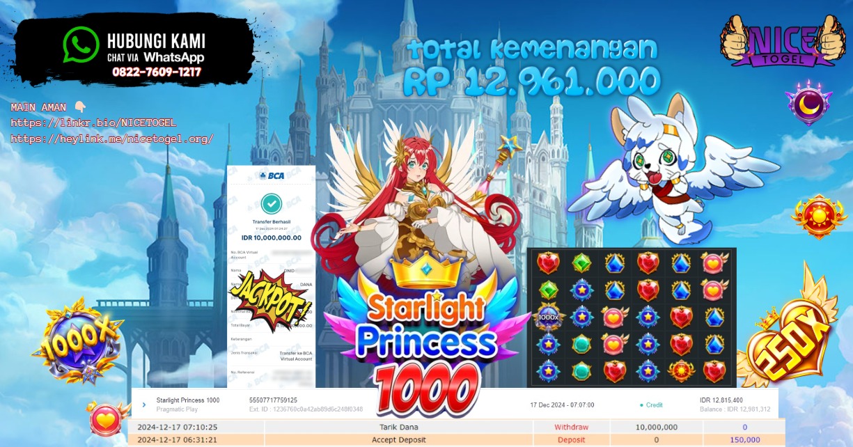 Selamat kepada User id : supr*** Telah berhasil mendapatkan kemenangan besar pada permainan SLOT STARLIGHT PRINCESS 1000 Dengan kemenangan Sebesar Rp.12.961.000,- Setelah mengisi formulir withdraw dengan kurung waktu hanya 5 – 10 menit pihak NICETOGEL sudah melakukan transfer kepada pemilik Userid dan dana sudah dapat di cairkan oleh pemenang. Bukti pembayaran yang kami berikan merupakan bukti pembayaran yang SAH / VALID yang langung di dapatkan melaui tanda transfer transaksi dari Bank yang di tuju.