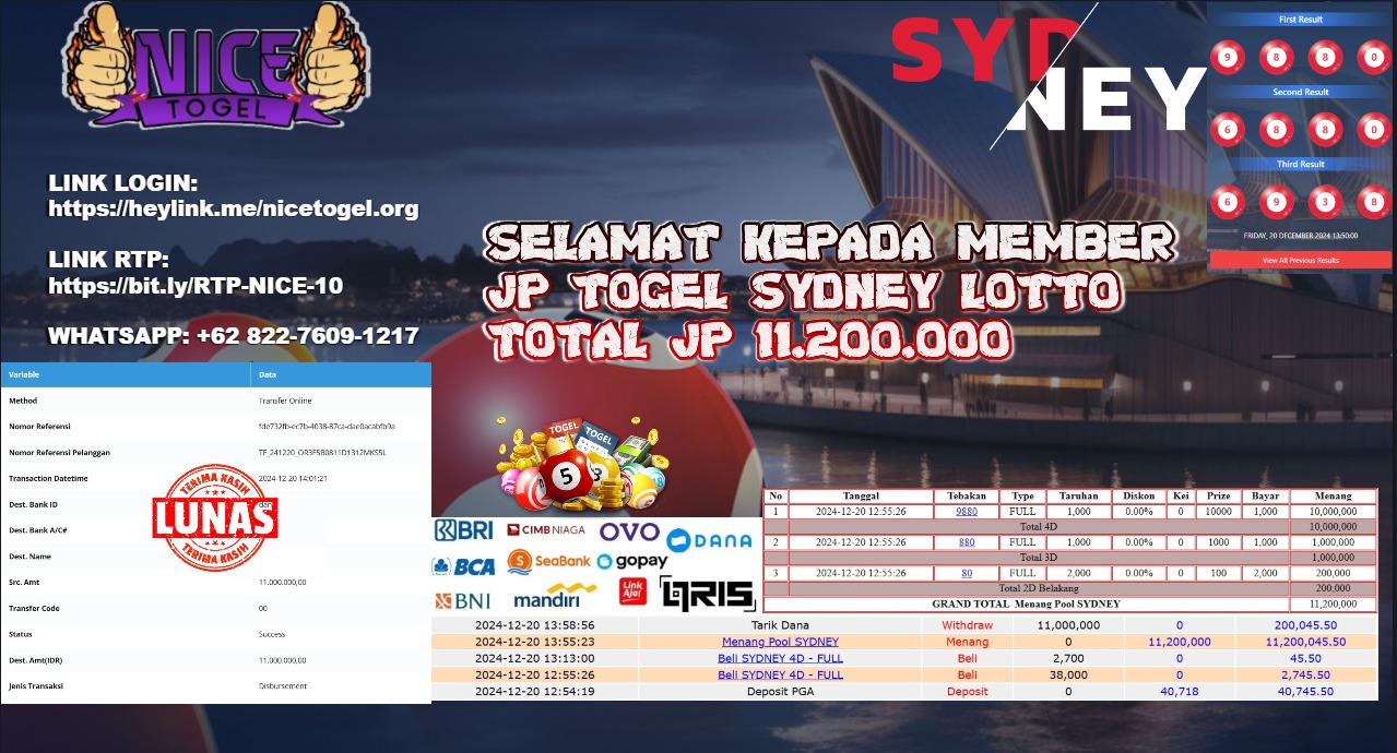 Selamat kepada User id : mog*** Telah berhasil mendapatkan kemenangan besar pada permainan TOGEL SYDNEY LOTTO Dengan kemenangan Sebesar Rp.11.200.000,- Setelah mengisi formulir withdraw dengan kurung waktu hanya 5 – 10 menit pihak NICETOGEL sudah melakukan transfer kepada pemilik Userid dan dana sudah dapat di cairkan oleh pemenang. Bukti pembayaran yang kami berikan merupakan bukti pembayaran yang SAH / VALID yang langung di dapatkan melaui tanda transfer transaksi dari Bank yang di tuju.
