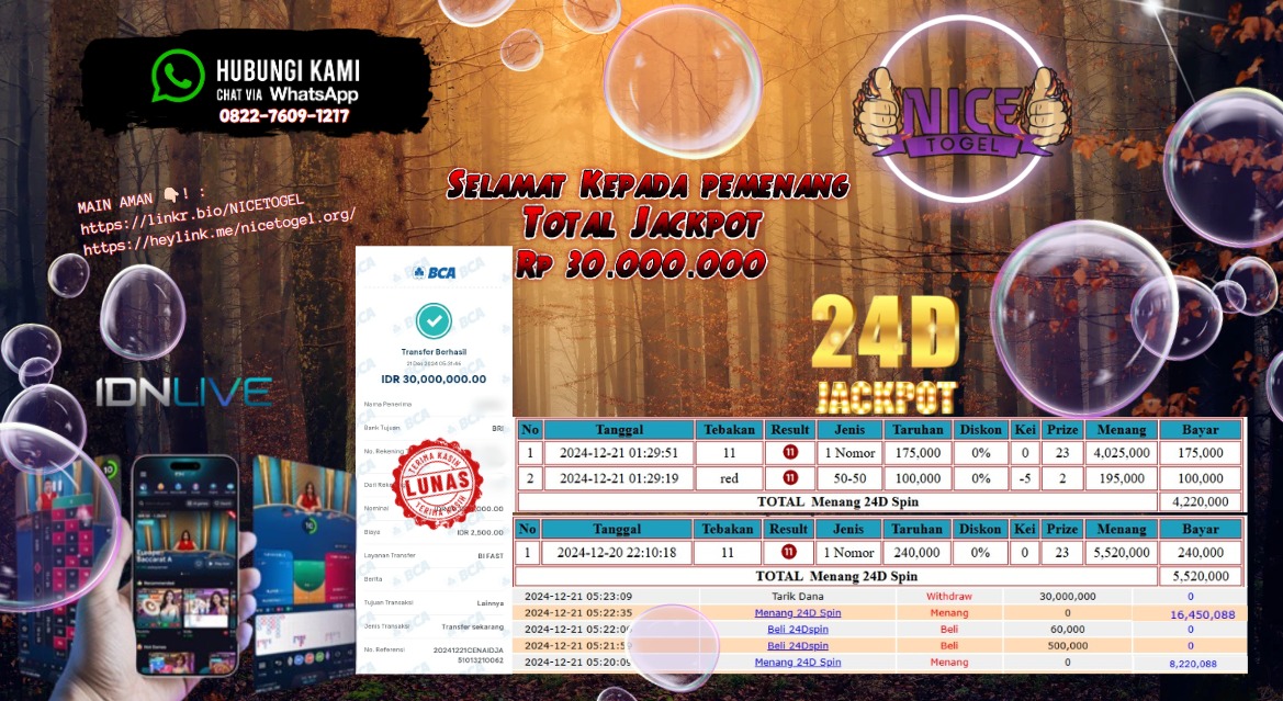 Selamat kepada User id : Euit7898*** Telah berhasil mendapatkan kemenangan besar pada permainan LIVE GAME 24D SPIN Dengan kemenangan Sebesar Rp.30.000.000,- Setelah mengisi formulir withdraw dengan kurung waktu hanya 5 – 10 menit pihak NICETOGEL sudah melakukan transfer kepada pemilik Userid dan dana sudah dapat di cairkan oleh pemenang. Bukti pembayaran yang kami berikan merupakan bukti pembayaran yang SAH / VALID yang langung di dapatkan melaui tanda transfer transaksi dari Bank yang di tuju.