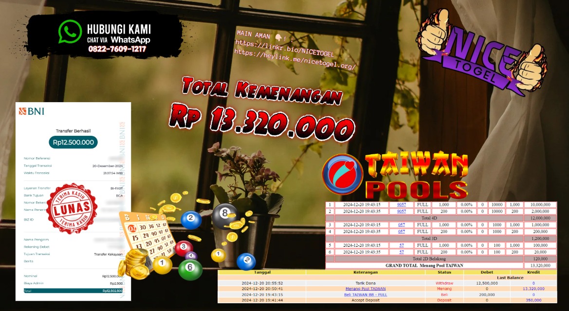 Selamat kepada User id : Toe59*** Telah berhasil mendapatkan kemenangan besar pada permainan TOGEL TAIWAN POOLS Dengan kemenangan Sebesar Rp.13.320.000,- Setelah mengisi formulir withdraw dengan kurung waktu hanya 5 – 10 menit pihak NICETOGEL sudah melakukan transfer kepada pemilik Userid dan dana sudah dapat di cairkan oleh pemenang. Bukti pembayaran yang kami berikan merupakan bukti pembayaran yang SAH / VALID yang langung di dapatkan melaui tanda transfer transaksi dari Bank yang di tuju.