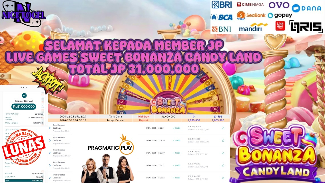 Selamat kepada User id : sat*** Telah berhasil mendapatkan kemenangan besar pada permainan LIVE GAMES SWEET BONANZA CANDYLAND Dengan kemenangan Sebesar Rp.31.000.000,- Setelah mengisi formulir withdraw dengan kurung waktu hanya 5 – 10 menit pihak NICETOGEL sudah melakukan transfer kepada pemilik Userid dan dana sudah dapat di cairkan oleh pemenang. Bukti pembayaran yang kami berikan merupakan bukti pembayaran yang SAH / VALID yang langung di dapatkan melaui tanda transfer transaksi dari Bank yang di tuju.