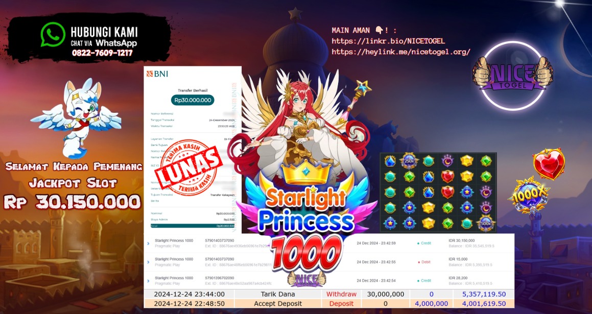 Selamat kepada User id : KON*** Telah berhasil mendapatkan kemenangan besar pada permainan SLOT STARLIGHT PRINCESS 1000 Dengan kemenangan Sebesar Rp.30.150.000,- Setelah mengisi formulir withdraw dengan kurung waktu hanya 5 – 10 menit pihak NICETOGEL sudah melakukan transfer kepada pemilik Userid dan dana sudah dapat di cairkan oleh pemenang. Bukti pembayaran yang kami berikan merupakan bukti pembayaran yang SAH / VALID yang langung di dapatkan melaui tanda transfer transaksi dari Bank yang di tuju.