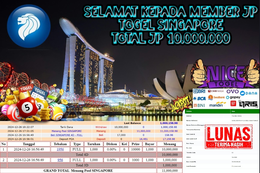 Selamat kepada User id : uja*** Telah berhasil mendapatkan kemenangan besar pada permainan TOGEL SINGAPORE Dengan kemenangan Sebesar Rp.10.000.000,- Setelah mengisi formulir withdraw dengan kurung waktu hanya 5 – 10 menit pihak NICETOGEL sudah melakukan transfer kepada pemilik Userid dan dana sudah dapat di cairkan oleh pemenang. Bukti pembayaran yang kami berikan merupakan bukti pembayaran yang SAH / VALID yang langung di dapatkan melaui tanda transfer transaksi dari Bank yang di tuju.