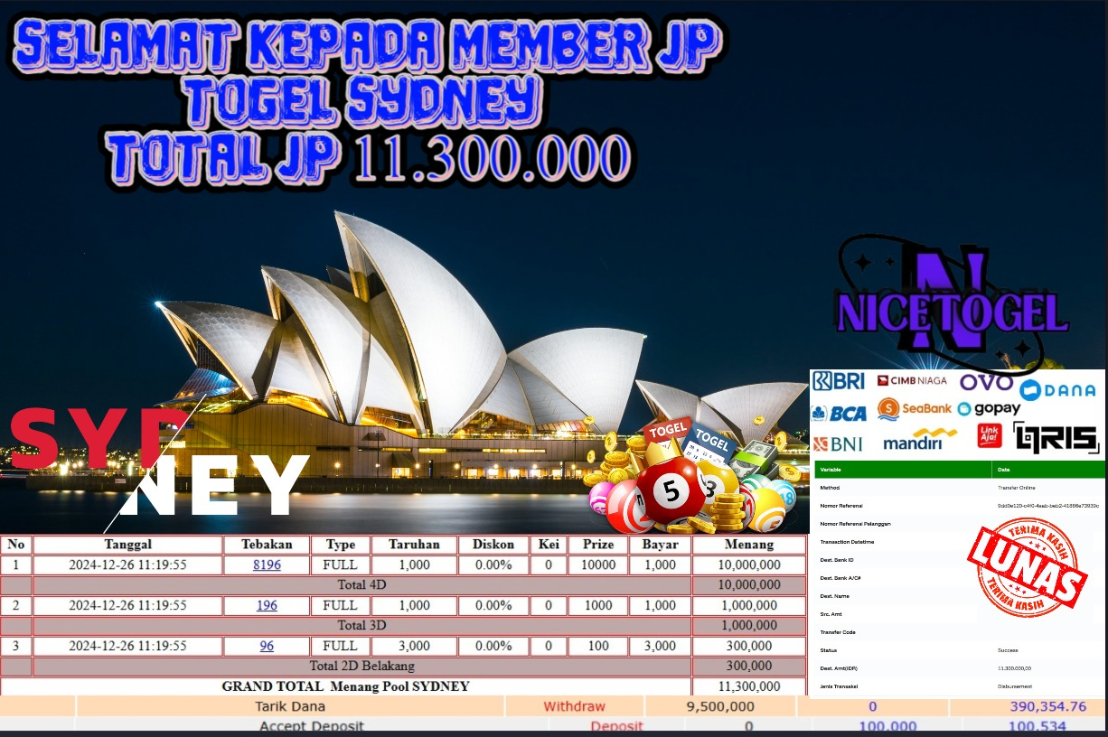 Selamat kepada User id : hak*** Telah berhasil mendapatkan kemenangan besar pada permainan TOGEL SYDNEY Dengan kemenangan Sebesar Rp.11.300.000,- Setelah mengisi formulir withdraw dengan kurung waktu hanya 5 – 10 menit pihak NICETOGEL sudah melakukan transfer kepada pemilik Userid dan dana sudah dapat di cairkan oleh pemenang. Bukti pembayaran yang kami berikan merupakan bukti pembayaran yang SAH / VALID yang langung di dapatkan melaui tanda transfer transaksi dari Bank yang di tuju.