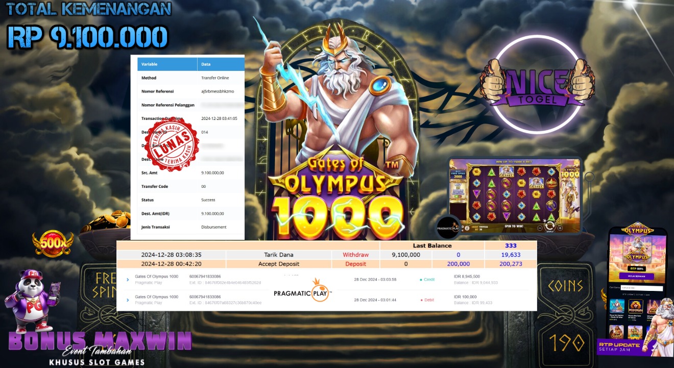 Selamat kepada User id : gus** Telah berhasil mendapatkan kemenangan besar pada permainan SLOT GATES OF OLYMPUS 1000 Dengan kemenangan Sebesar Rp.9.100.000,- Setelah mengisi formulir withdraw dengan kurung waktu hanya 5 – 10 menit pihak NICETOGEL sudah melakukan transfer kepada pemilik Userid dan dana sudah dapat di cairkan oleh pemenang. Bukti pembayaran yang kami berikan merupakan bukti pembayaran yang SAH / VALID yang langung di dapatkan melaui tanda transfer transaksi dari Bank yang di tuju.