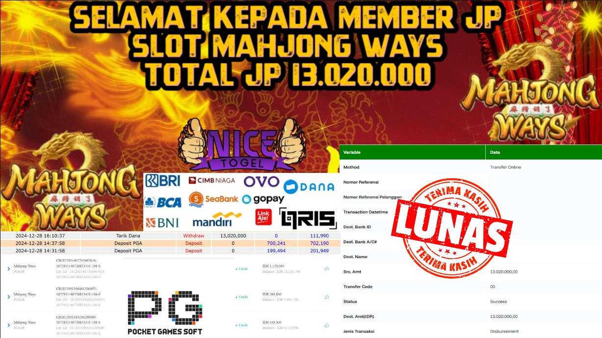 Selamat kepada User id : gam** Telah berhasil mendapatkan kemenangan besar pada permainan SLOT MAHJONG WAYS Dengan kemenangan Sebesar Rp.13.020.000,- Setelah mengisi formulir withdraw dengan kurung waktu hanya 5 – 10 menit pihak NICETOGEL sudah melakukan transfer kepada pemilik Userid dan dana sudah dapat di cairkan oleh pemenang. Bukti pembayaran yang kami berikan merupakan bukti pembayaran yang SAH / VALID yang langung di dapatkan melaui tanda transfer transaksi dari Bank yang di tuju.