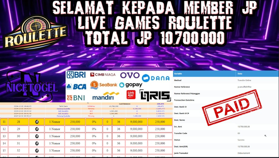 Selamat kepada User id : mon** Telah berhasil mendapatkan kemenangan besar pada permainan LIVE GAMES ROULETTE Dengan kemenangan Sebesar Rp.10.700.000,- Setelah mengisi formulir withdraw dengan kurung waktu hanya 5 – 10 menit pihak NICETOGEL sudah melakukan transfer kepada pemilik Userid dan dana sudah dapat di cairkan oleh pemenang. Bukti pembayaran yang kami berikan merupakan bukti pembayaran yang SAH / VALID yang langung di dapatkan melaui tanda transfer transaksi dari Bank yang di tuju.