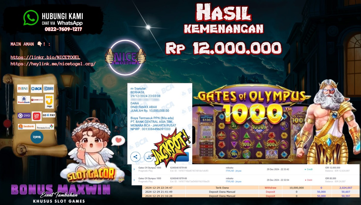 Selamat kepada User id : Ali5*** Telah berhasil mendapatkan kemenangan besar pada permainan SLOT GATES OF OLYMPUS 1000 Dengan kemenangan Sebesar Rp.12.000.000,- Setelah mengisi formulir withdraw dengan kurung waktu hanya 5 – 10 menit pihak NICETOGEL sudah melakukan transfer kepada pemilik Userid dan dana sudah dapat di cairkan oleh pemenang. Bukti pembayaran yang kami berikan merupakan bukti pembayaran yang SAH / VALID yang langung di dapatkan melaui tanda transfer transaksi dari Bank yang di tuju.