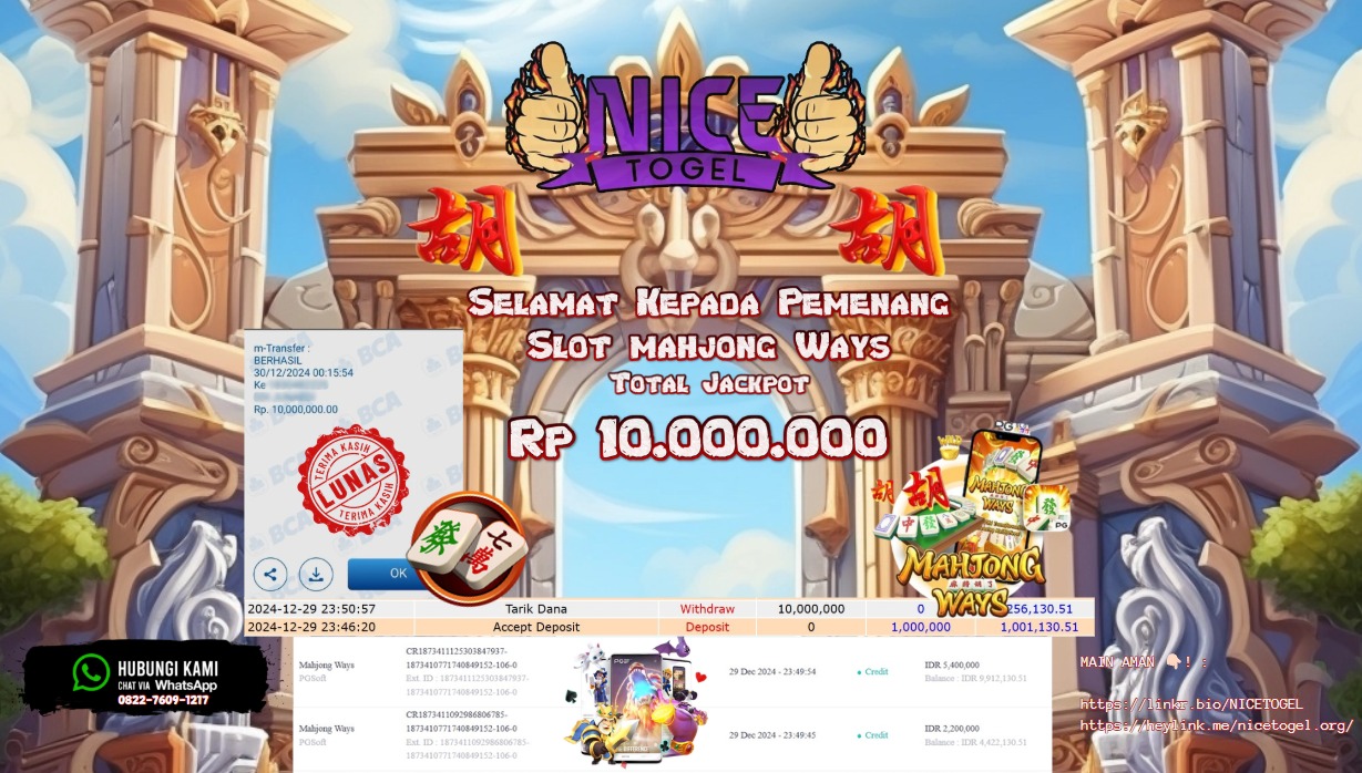Selamat kepada User id : daff*** Telah berhasil mendapatkan kemenangan besar pada permainan SLOT MAHJONG WAYS Dengan kemenangan Sebesar Rp.10.000.000,- Setelah mengisi formulir withdraw dengan kurung waktu hanya 5 – 10 menit pihak NICETOGEL sudah melakukan transfer kepada pemilik Userid dan dana sudah dapat di cairkan oleh pemenang. Bukti pembayaran yang kami berikan merupakan bukti pembayaran yang SAH / VALID yang langung di dapatkan melaui tanda transfer transaksi dari Bank yang di tuju.