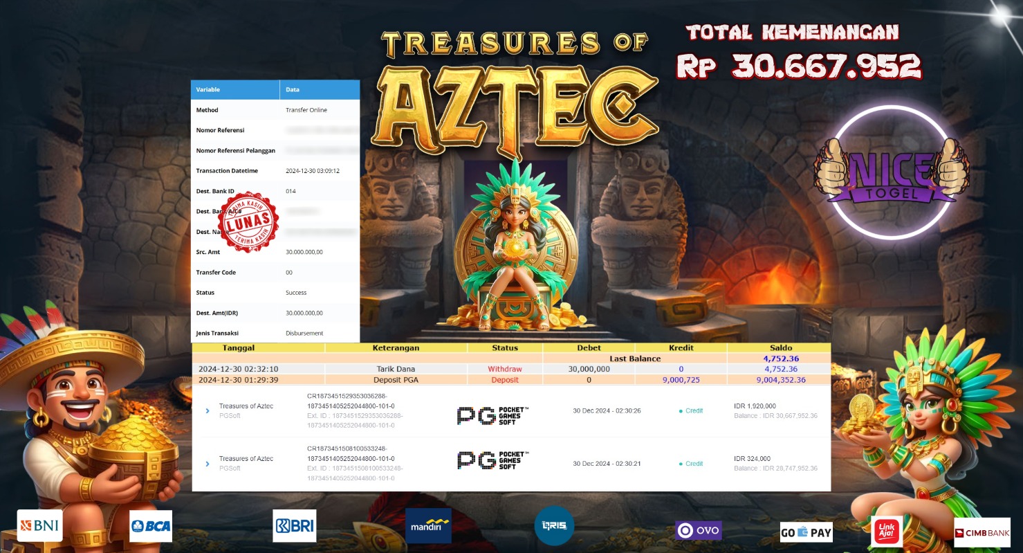 Selamat kepada User id : surt*** Telah berhasil mendapatkan kemenangan besar pada permainan SLOT TREASURES OF AZTEC Dengan kemenangan Sebesar Rp.30.667.952,- Setelah mengisi formulir withdraw dengan kurung waktu hanya 5 – 10 menit pihak NICETOGEL sudah melakukan transfer kepada pemilik Userid dan dana sudah dapat di cairkan oleh pemenang. Bukti pembayaran yang kami berikan merupakan bukti pembayaran yang SAH / VALID yang langung di dapatkan melaui tanda transfer transaksi dari Bank yang di tuju.