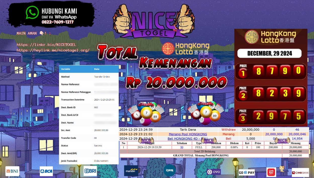 Selamat kepada User id : Ert*** Telah berhasil mendapatkan kemenangan besar pada permainan TOGEL HONGKONG LOTTO Dengan kemenangan Sebesar Rp.20.000.000,- Setelah mengisi formulir withdraw dengan kurung waktu hanya 5 – 10 menit pihak NICETOGEL sudah melakukan transfer kepada pemilik Userid dan dana sudah dapat di cairkan oleh pemenang. Bukti pembayaran yang kami berikan merupakan bukti pembayaran yang SAH / VALID yang langung di dapatkan melaui tanda transfer transaksi dari Bank yang di tuju.