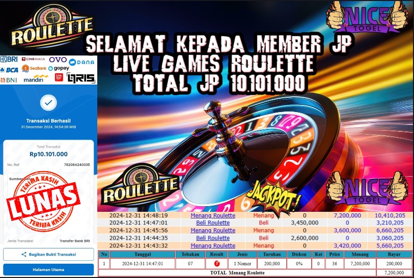 Selamat kepada User id : n** Telah berhasil mendapatkan kemenangan besar pada permainan LIVE GAMES ROULETTE Dengan kemenangan Sebesar Rp.10.101.000,- Setelah mengisi formulir withdraw dengan kurung waktu hanya 5 – 10 menit pihak NICETOGEL sudah melakukan transfer kepada pemilik Userid dan dana sudah dapat di cairkan oleh pemenang. Bukti pembayaran yang kami berikan merupakan bukti pembayaran yang SAH / VALID yang langung di dapatkan melaui tanda transfer transaksi dari Bank yang di tuju.