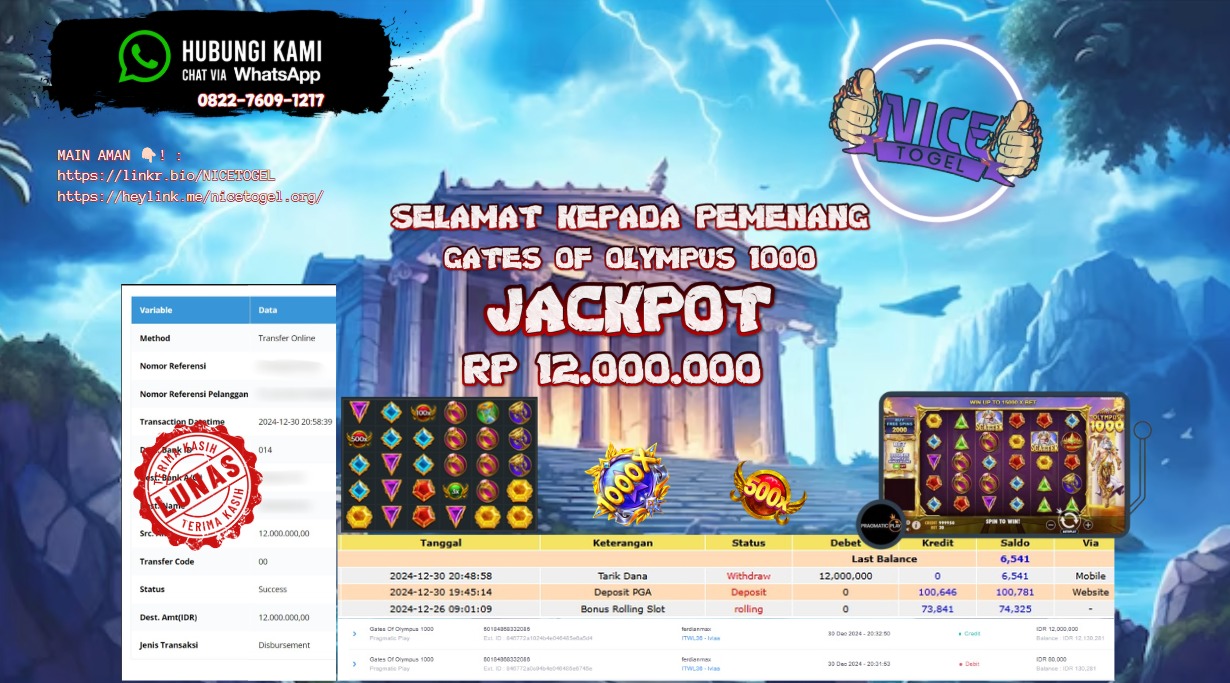 Selamat kepada User id : supr*** Telah berhasil mendapatkan kemenangan besar pada permainan SLOT GATES OF OLYMPUS 1000 Dengan kemenangan Sebesar Rp.12.000.000,- Setelah mengisi formulir withdraw dengan kurung waktu hanya 5 – 10 menit pihak NICETOGEL sudah melakukan transfer kepada pemilik Userid dan dana sudah dapat di cairkan oleh pemenang. Bukti pembayaran yang kami berikan merupakan bukti pembayaran yang SAH / VALID yang langung di dapatkan melaui tanda transfer transaksi dari Bank yang di tuju.