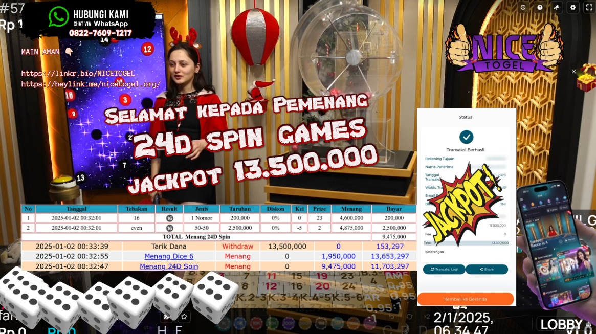 Selamat kepada User id : gus** Telah berhasil mendapatkan kemenangan besar pada permainan LIVE GAMES 24D SPIN GAMES Dengan kemenangan Sebesar Rp.13.500.000,- Setelah mengisi formulir withdraw dengan kurung waktu hanya 5 – 10 menit pihak NICETOGEL sudah melakukan transfer kepada pemilik Userid dan dana sudah dapat di cairkan oleh pemenang. Bukti pembayaran yang kami berikan merupakan bukti pembayaran yang SAH / VALID yang langung di dapatkan melaui tanda transfer transaksi dari Bank yang di tuju.