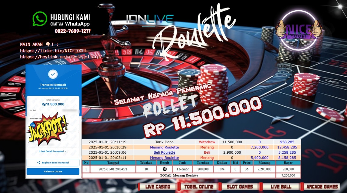 Selamat kepada User id : gew** Telah berhasil mendapatkan kemenangan besar pada permainan LIVE GAMES ROULETTE Dengan kemenangan Sebesar Rp.11.500.000,- Setelah mengisi formulir withdraw dengan kurung waktu hanya 5 – 10 menit pihak NICETOGEL sudah melakukan transfer kepada pemilik Userid dan dana sudah dapat di cairkan oleh pemenang. Bukti pembayaran yang kami berikan merupakan bukti pembayaran yang SAH / VALID yang langung di dapatkan melaui tanda transfer transaksi dari Bank yang di tuju.