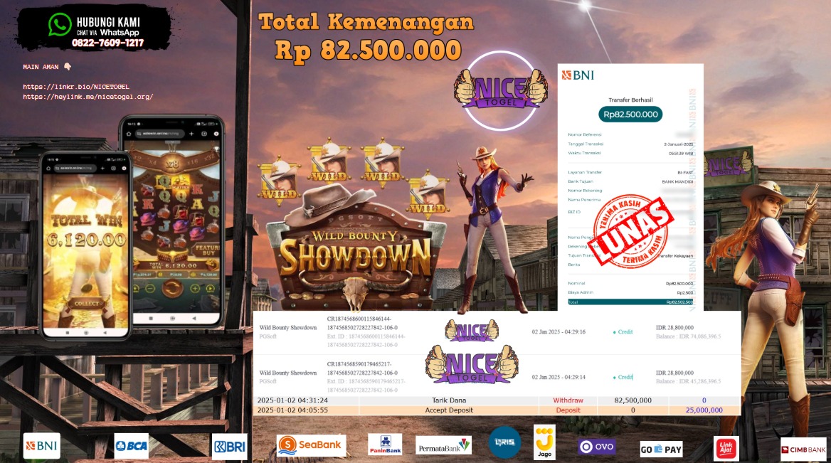 Selamat kepada User id : algo** Telah berhasil mendapatkan kemenangan besar pada permainan SLOT WILD BOUNTY SHOWDOWN Dengan kemenangan Sebesar Rp.82.500.000,- Setelah mengisi formulir withdraw dengan kurung waktu hanya 5 – 10 menit pihak NICETOGEL sudah melakukan transfer kepada pemilik Userid dan dana sudah dapat di cairkan oleh pemenang. Bukti pembayaran yang kami berikan merupakan bukti pembayaran yang SAH / VALID yang langung di dapatkan melaui tanda transfer transaksi dari Bank yang di tuju.
