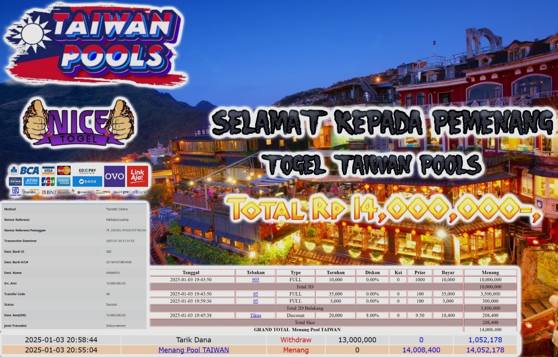 Selamat kepada User id : Poe56** Telah berhasil mendapatkan kemenangan besar pada permainan TOGEL TAIWAN POOLS Dengan kemenangan Sebesar Rp.14.000.000,- Setelah mengisi formulir withdraw dengan kurung waktu hanya 5 – 10 menit pihak NICETOGEL sudah melakukan transfer kepada pemilik Userid dan dana sudah dapat di cairkan oleh pemenang. Bukti pembayaran yang kami berikan merupakan bukti pembayaran yang SAH / VALID yang langung di dapatkan melaui tanda transfer transaksi dari Bank yang di tuju.