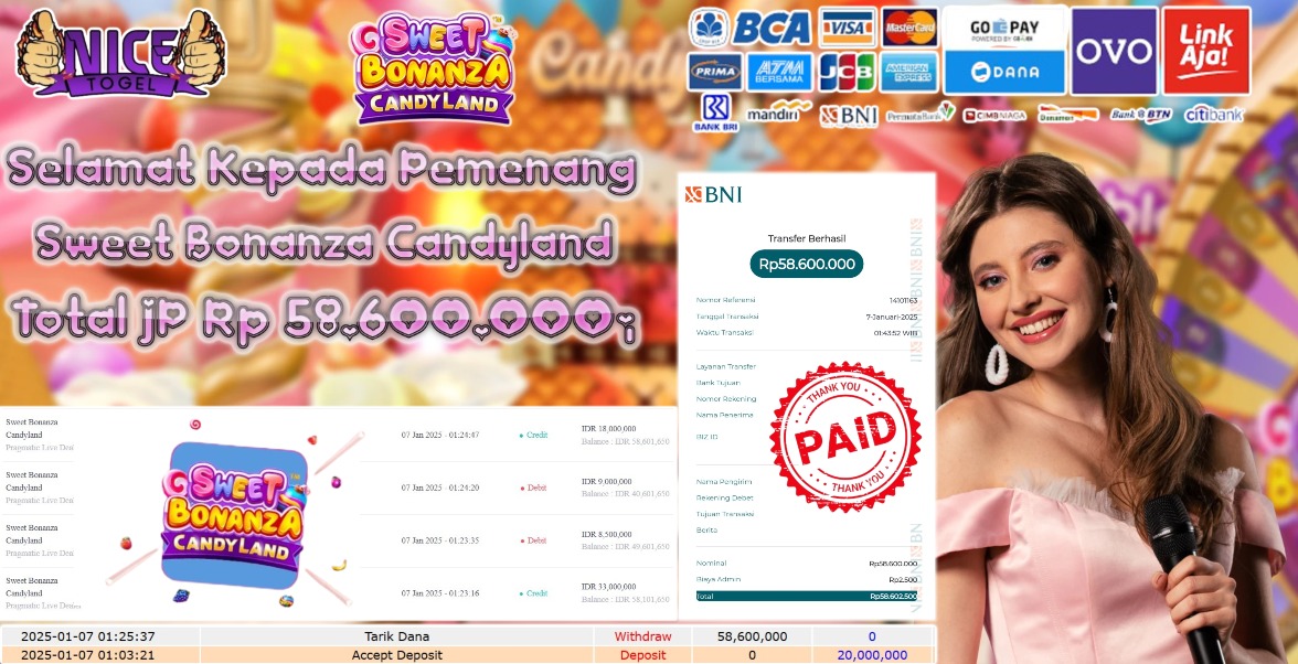 Selamat kepada User id : haEr** Telah berhasil mendapatkan kemenangan besar pada permainan SLOT SWEET BONANZA CANDYLAND Dengan kemenangan Sebesar Rp.58.600.000,- Setelah mengisi formulir withdraw dengan kurung waktu hanya 5 – 10 menit pihak NICETOGEL sudah melakukan transfer kepada pemilik Userid dan dana sudah dapat di cairkan oleh pemenang. Bukti pembayaran yang kami berikan merupakan bukti pembayaran yang SAH / VALID yang langung di dapatkan melaui tanda transfer transaksi dari Bank yang di tuju.