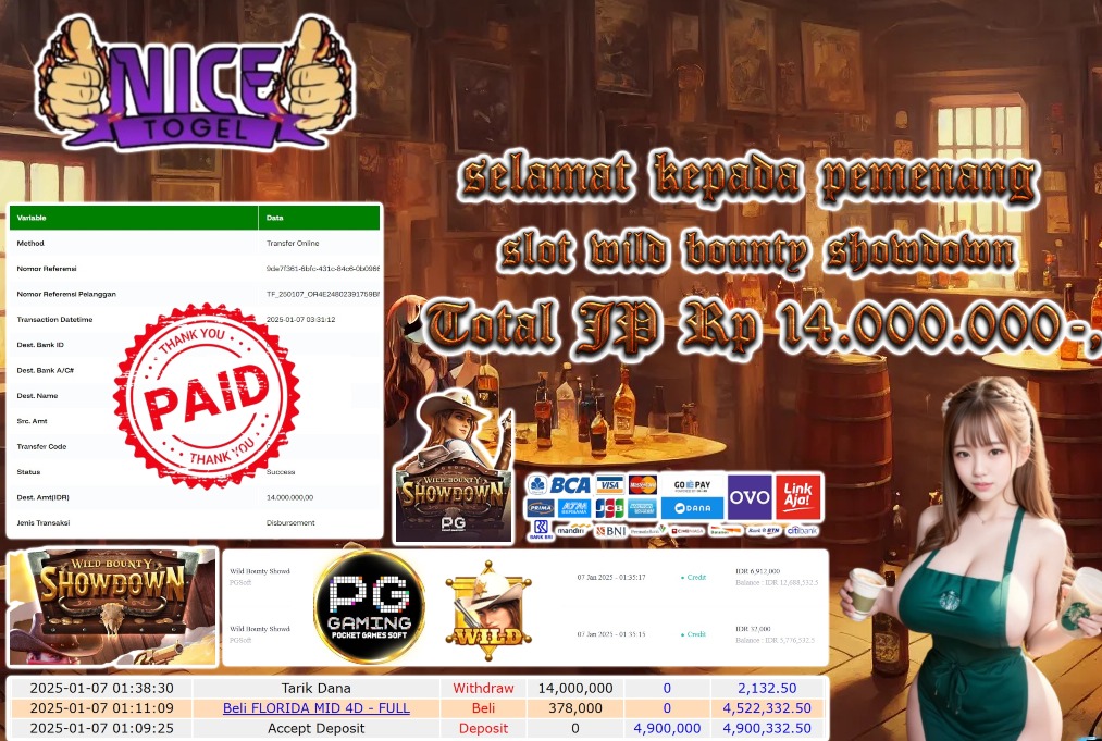 Selamat kepada User id : yuer** Telah berhasil mendapatkan kemenangan besar pada permainan SLOT WILD BOUNTY SHOWDOWN Dengan kemenangan Sebesar Rp.14.000.000,- Setelah mengisi formulir withdraw dengan kurung waktu hanya 5 – 10 menit pihak NICETOGEL sudah melakukan transfer kepada pemilik Userid dan dana sudah dapat di cairkan oleh pemenang. Bukti pembayaran yang kami berikan merupakan bukti pembayaran yang SAH / VALID yang langung di dapatkan melaui tanda transfer transaksi dari Bank yang di tuju.