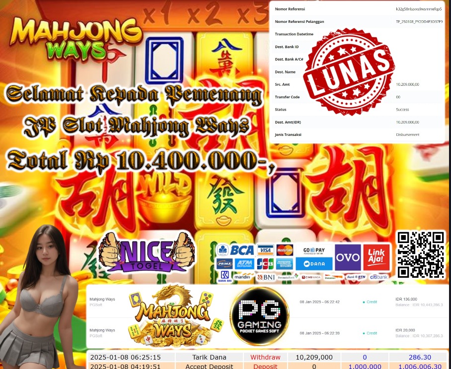 Selamat kepada User id : febr** Telah berhasil mendapatkan kemenangan besar pada permainan SLOT MAHJONG WAYS Dengan kemenangan Sebesar Rp.10.400.000,- Setelah mengisi formulir withdraw dengan kurung waktu hanya 5 – 10 menit pihak NICETOGEL sudah melakukan transfer kepada pemilik Userid dan dana sudah dapat di cairkan oleh pemenang. Bukti pembayaran yang kami berikan merupakan bukti pembayaran yang SAH / VALID yang langung di dapatkan melaui tanda transfer transaksi dari Bank yang di tuju.