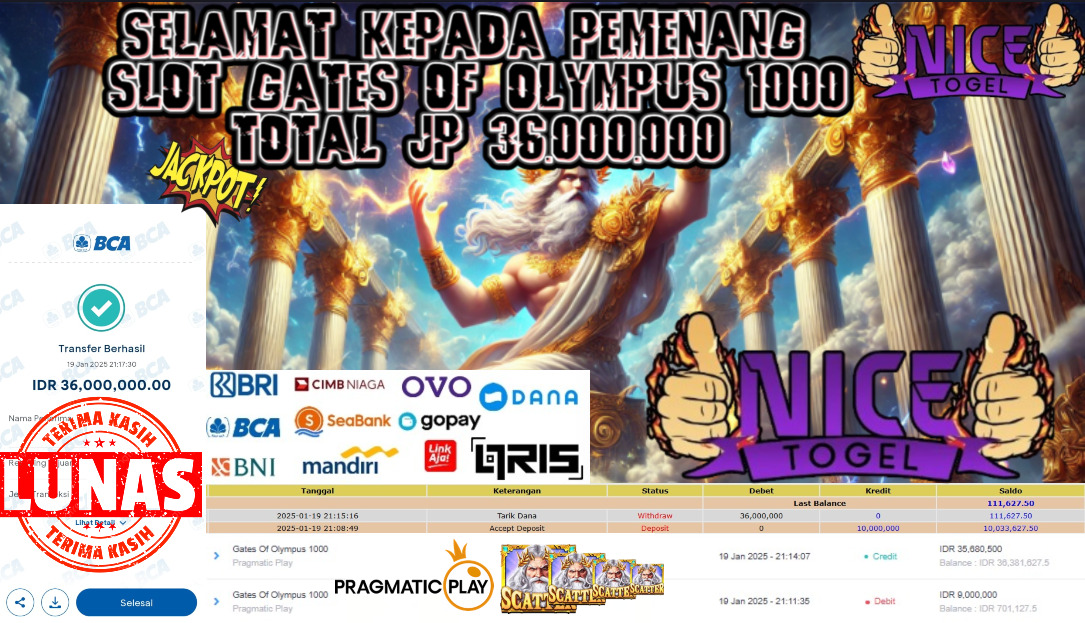 Selamat kepada User id : KUMI** Telah berhasil mendapatkan kemenangan besar pada permainan SLOT GATES OF OLYMPUS 1000 Dengan kemenangan Sebesar Rp.36.000.000,- Setelah mengisi formulir withdraw dengan kurung waktu hanya 5 – 10 menit pihak NICETOGEL sudah melakukan transfer kepada pemilik Userid dan dana sudah dapat di cairkan oleh pemenang. Bukti pembayaran yang kami berikan merupakan bukti pembayaran yang SAH / VALID yang langung di dapatkan melaui tanda transfer transaksi dari Bank yang di tuju.