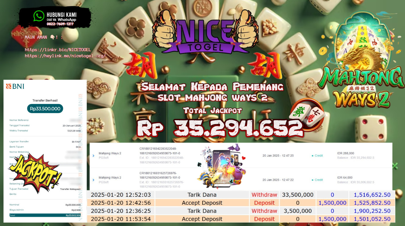Selamat kepada User id : har** Telah berhasil mendapatkan kemenangan besar pada permainan SLOT MAHJONG WAYS 2 Dengan kemenangan Sebesar Rp.35.294.652,- Setelah mengisi formulir withdraw dengan kurung waktu hanya 5 – 10 menit pihak NICETOGEL sudah melakukan transfer kepada pemilik Userid dan dana sudah dapat di cairkan oleh pemenang. Bukti pembayaran yang kami berikan merupakan bukti pembayaran yang SAH / VALID yang langung di dapatkan melaui tanda transfer transaksi dari Bank yang di tuju.