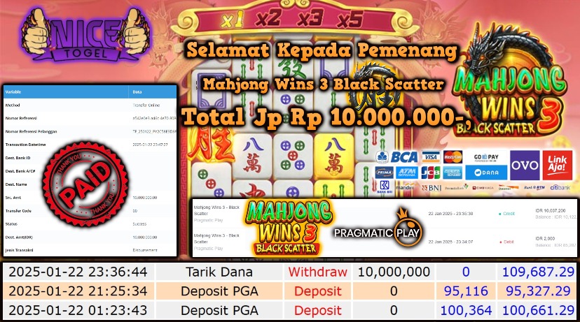 Selamat kepada User id : KOMSE** Telah berhasil mendapatkan kemenangan besar pada permainan SLOT MAHJONG WINS 3 Dengan kemenangan Sebesar Rp.10.000.000,- Setelah mengisi formulir withdraw dengan kurung waktu hanya 5 – 10 menit pihak NICETOGEL sudah melakukan transfer kepada pemilik Userid dan dana sudah dapat di cairkan oleh pemenang. Bukti pembayaran yang kami berikan merupakan bukti pembayaran yang SAH / VALID yang langung di dapatkan melaui tanda transfer transaksi dari Bank yang di tuju.