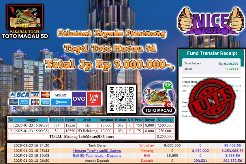 Selamat kepada User id : Heri** Telah berhasil mendapatkan kemenangan besar pada permainan TOGEL TOTO MACAU 5D Dengan kemenangan Sebesar Rp.9.000.000,- Setelah mengisi formulir withdraw dengan kurung waktu hanya 5 – 10 menit pihak NICETOGEL sudah melakukan transfer kepada pemilik Userid dan dana sudah dapat di cairkan oleh pemenang. Bukti pembayaran yang kami berikan merupakan bukti pembayaran yang SAH / VALID yang langung di dapatkan melaui tanda transfer transaksi dari Bank yang di tuju.