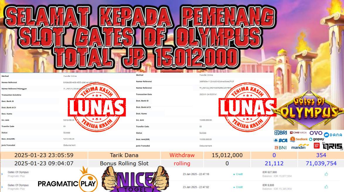 Selamat kepada User id : Yusd01** Telah berhasil mendapatkan kemenangan besar padaSLOT GATES OF OLYMPUS 1000 Dengan kemenangan Sebesar Rp.15.012.000,- Setelah mengisi formulir withdraw dengan kurung waktu hanya 5 – 10 menit pihak NICETOGEL sudah melakukan transfer kepada pemilik Userid dan dana sudah dapat di cairkan oleh pemenang. Bukti pembayaran yang kami berikan merupakan bukti pembayaran yang SAH / VALID yang langung di dapatkan melaui tanda transfer transaksi dari Bank yang di tuju.
