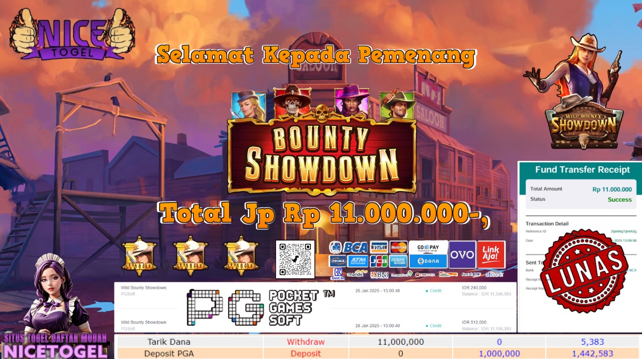 Selamat kepada User id : rawa8** Telah berhasil mendapatkan kemenangan besar pada permainan SLOT WILD BOUNTY SHOWDOWN Dengan kemenangan Sebesar Rp.11.000.000,- Setelah mengisi formulir withdraw dengan kurung waktu hanya 5 – 10 menit pihak NICETOGEL sudah melakukan transfer kepada pemilik Userid dan dana sudah dapat di cairkan oleh pemenang. Bukti pembayaran yang kami berikan merupakan bukti pembayaran yang SAH / VALID yang langung di dapatkan melaui tanda transfer transaksi dari Bank yang di tuju.