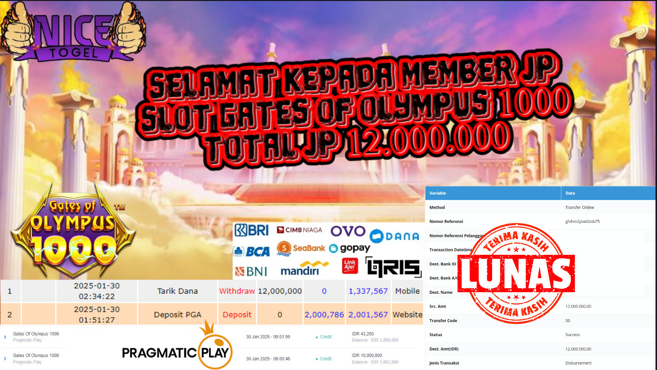 Selamat kepada User id : IMCO** Telah berhasil mendapatkan kemenangan besar pada permainan SLOT GATES OF OLYMPUS 1000 Dengan kemenangan Sebesar Rp.12.000.000,- Setelah mengisi formulir withdraw dengan kurung waktu hanya 5 – 10 menit pihak NICETOGEL sudah melakukan transfer kepada pemilik Userid dan dana sudah dapat di cairkan oleh pemenang. Bukti pembayaran yang kami berikan merupakan bukti pembayaran yang SAH / VALID yang langung di dapatkan melaui tanda transfer transaksi dari Bank yang di tuju.