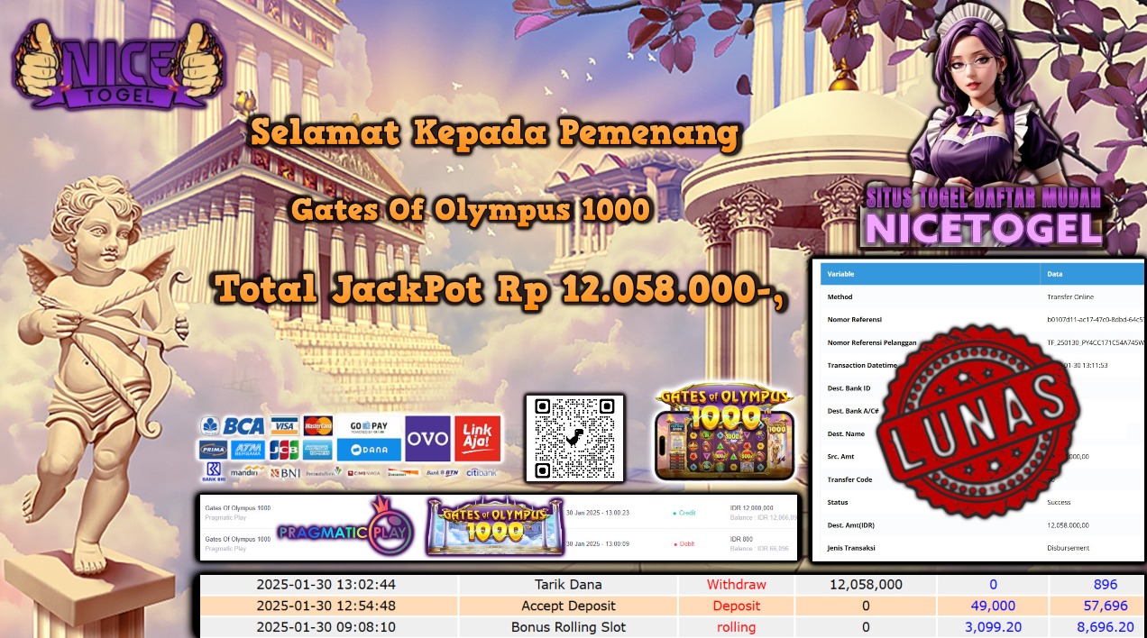 Selamat kepada User id : Rade88** Telah berhasil mendapatkan kemenangan besar pada permainan SLOT GATES OF OLYMPUS 1000 Dengan kemenangan Sebesar Rp.12.058.000,- Setelah mengisi formulir withdraw dengan kurung waktu hanya 5 – 10 menit pihak NICETOGEL sudah melakukan transfer kepada pemilik Userid dan dana sudah dapat di cairkan oleh pemenang. Bukti pembayaran yang kami berikan merupakan bukti pembayaran yang SAH / VALID yang langung di dapatkan melaui tanda transfer transaksi dari Bank yang di tuju.